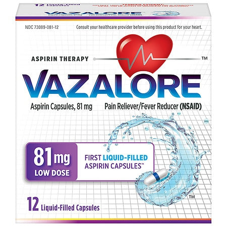 Vazalore Aspirin 81 mg Adult aspirin Liquid-Filled Capsules Low Dose Aspirin Therapy 12 ct. Discover Vazalore 81 mg liquid-filled aspirin capsules. The first and only liquid-filled aspirin capsules specially designed to help protect your stomach. The special complex inside the Vazalore capsule allows for targeted release of aspirin limiting its direct contact with the stomach. Vazalore delivers fast reliable absorption to give you the lifesaving benefits of aspirin to help prevent another heart attack or clot-related stroke. Vazalore also provides fast temporary pain relief and fever reduction. Vazalore 81 mg low dose liquid-filled aspirin capsules. Heart protection with your stomach in mind. Immediate release Vazalore aspirin capsules help reduce the risk of another heart attack or clot-related stroke. Vazalore liquid-filled aspirin capsules deliver aspirin differently than enteric coated aspirin and chewable aspirin products. Vazalore aspirin is BOTH quickly absorbed and limits direct contact with t