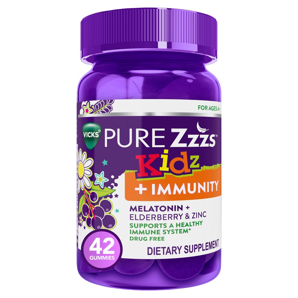 VICKS PURE Zzzs Kidz + Immunity is thoughtfully designed with your child in mind. They are specially designed with a low dose of melatonin to help your child fall asleep naturally + zinc to help support their immune system while they sleep*. This dietary supplement sleep aid works to support your child s natural sleep cycle and supports a healthy immune system*. These gummies contain Zinc an essential mineral that provides immune system support.* VICKS PURE Zzzs Kidz + Immunity melatonin gummies are a great choice when your child is dealing with occasional sleeplessness and you are looking for a way to support their healthy immune system.* Our Vicks PURE Zzzs Kidz products are crafted with kids in mind and have a low dose of only 0.5 mg per gummy (1 mg melatonin per serving) to help with your child fall asleep naturally plus a complementary botanical blend of chamomile and lavender.*From the makers of Zzz Quil the World s #1 Sleep Aid Brand!*These statements have not been evaluated by the Food and Drug Adm