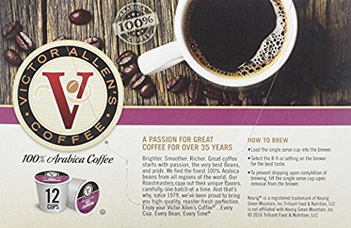 Includes 12 Single Serve K-cup Coffee Pods A warm and aromatic medium roast. Lively and bright, starting rich and warmly aromaticbut landing softly with its mild acidity. For use in all single serve brewing systems, including Keurig 2.0 Since 1979 Victor Allen has been proud to bring you high-quality, roaster-fresh perfection. We source 100% Arabica beans from all over the world and use precision roasting techniques to guarantee the very best coffee. Victor Allen offers a wide selection of coffee choices from light, medium and dark roasts to everyday and seasonal flavors, in bagged, single serve and ready to drink formats.