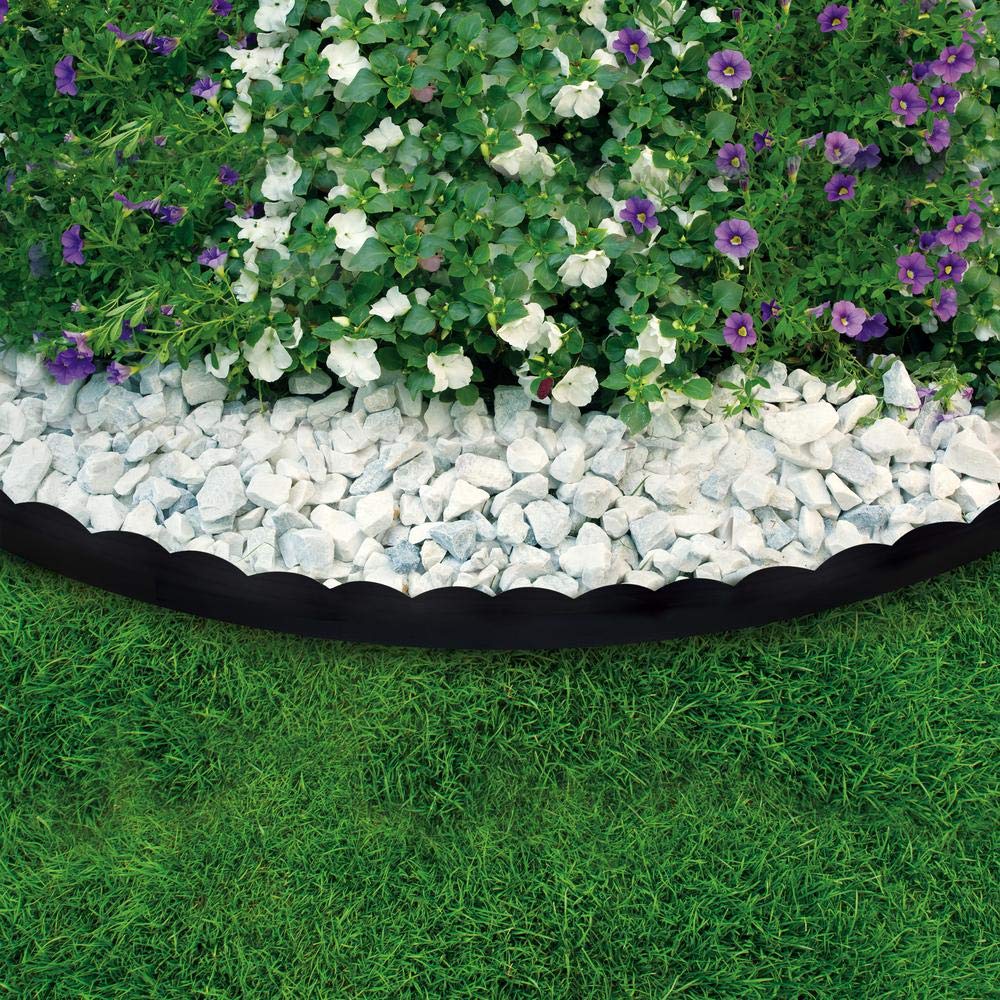Vigoro 20 ft. Scallop Top No-Dig Edging is easy to install right out of the box. The innovative scallop top design provides a decorative look throughout the length of the edging. No straightening or heating in the sun to make it flexible. A durable decorative design with a 2 in. wall height. To install, lay edging in desired shape and location, and hammer anchoring spikes through the tabs on the edging. It is recommended to place the spikes a maximum of 40 in. apart. To cut edging, use clippers or a hand saw, and cut an equal distance between 2 tabs. Always wear appropriate eye protection when cutting. Continuous coil with decorative scallop top design No digging required for quick and easy installation Makes curves and straight sections with ease Flexible and durable for many landscaping projects Includes 6 spikes and 1 connector