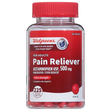 For adults. Acetaminophen USP, 500 mg, pain reliever / fever reducer. Contain no aspirin. Compare to the active ingredient in Extra Strength Tylenol.tt Walgreens Pharmacist recommended.t walgreens.com. Questions or comments? call 1-877-770-3183 Mon-Fri 8:00 AM EST to 5:00 PM PST. how2recycle.info. tOur pharmacists recommend the Walgreens brand. We invite you to compare to national brands. ttAll trademarks are property of their respective owners. This product is not affiliated with the