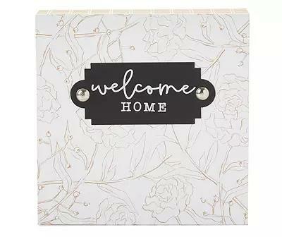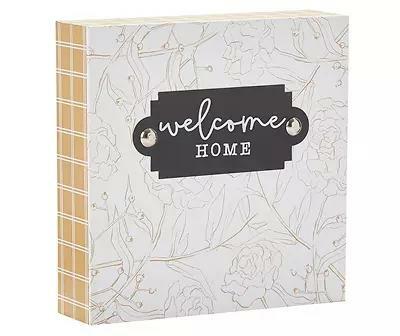 Add a welcoming accent to your home with this elegant box plaque defined by an allover floral print on the front topped by a black label with metal pins on either side. The wide frame design allows for freestanding display and features a golden plaid print.