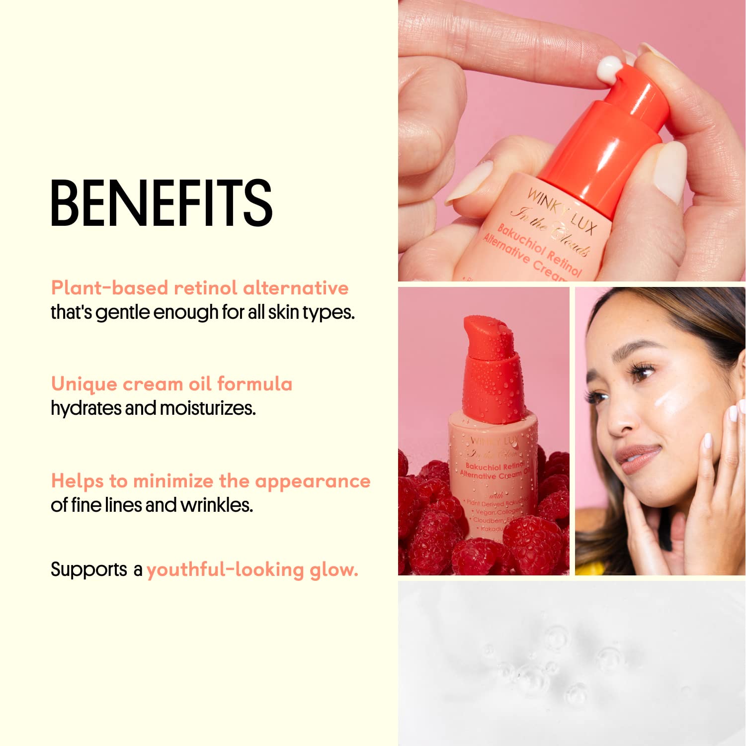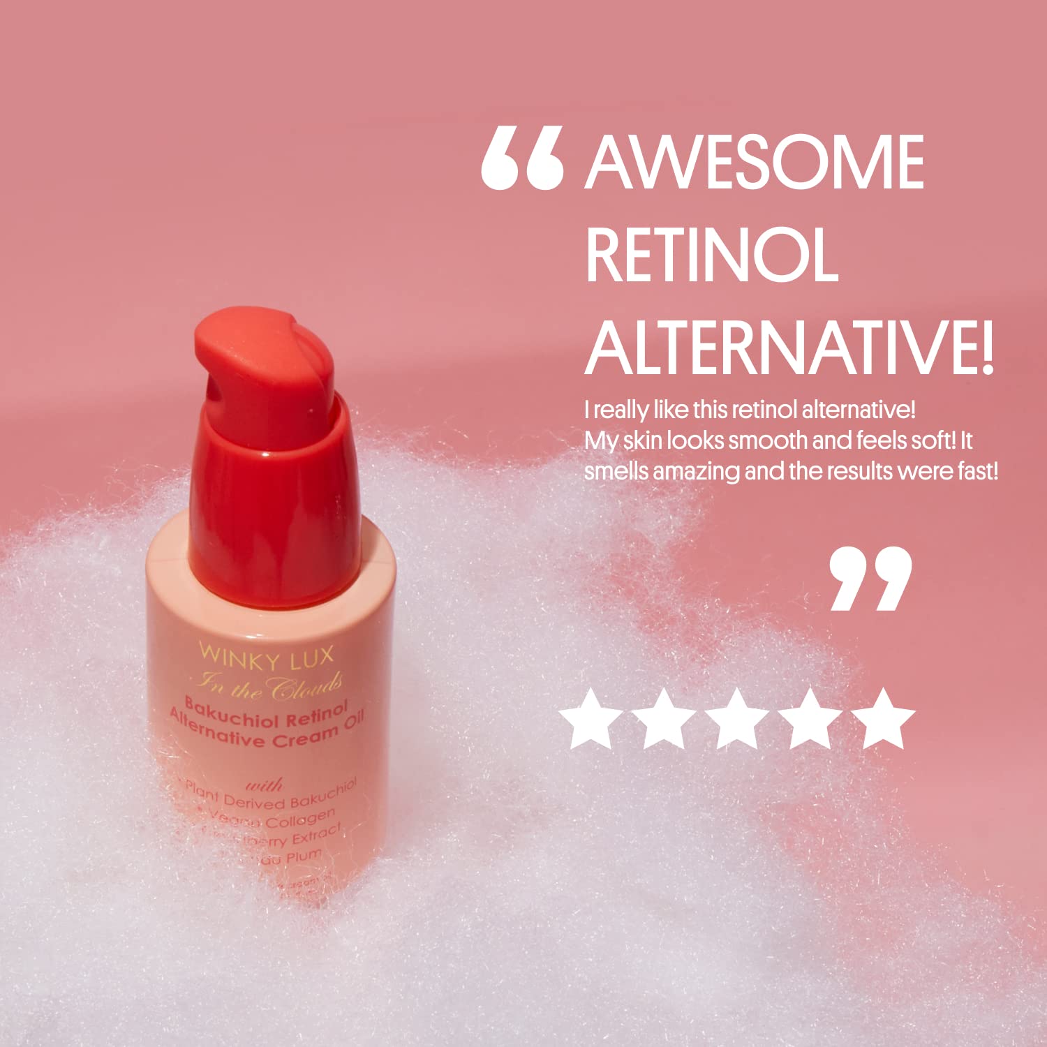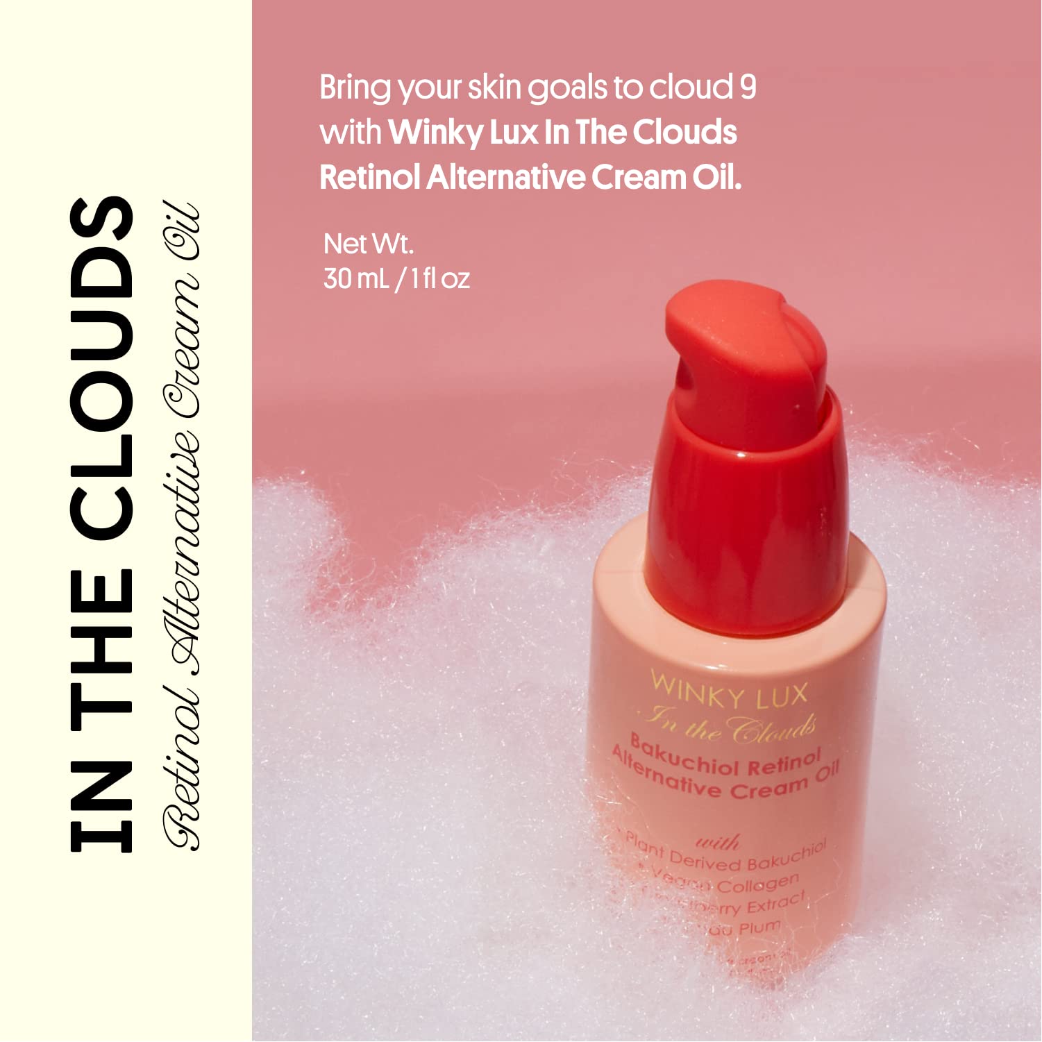 Bring your skin goals to cloud 9 with Winky Lux In the Clouds Retinol Alternative. This unique bi-phase cream oil is powered by bakuchiol, a plant-based retinol alternative that offers all of the skin-renewing results without irritation. Vegan collagen and kakadu plum work to support a bright, even-toned complexionand leave it to cloudberry extract for protecting antioxidants! Gentle enough for daily use, In the Clouds delivers dream-like skin day after day. Get to Know the Benefits: - Bakuchiol: Plant-based retinol alternative helps to minimize the appearance of fine lines, wrinkles and pores while increasing skin firmness and elasticity for a replenished, youthful-looking complexion - Vegan collagen: Plant-based collagen helps to renew and smooth skin by decreasing the appearance of hyperpigmentation and fine lines - Cloudberry extract: Provides antioxidants that help to protect skin against environmental aggressors - Kakadu plum: Rich in Vitamin C helping to brighten, smooth and balance uneven skin tone Directions: - Apply 1-2 pumps after cleansing and toning to face, neck and chest. - Always use sunscreen when using retinol or retinol alternatives like In the Clouds.