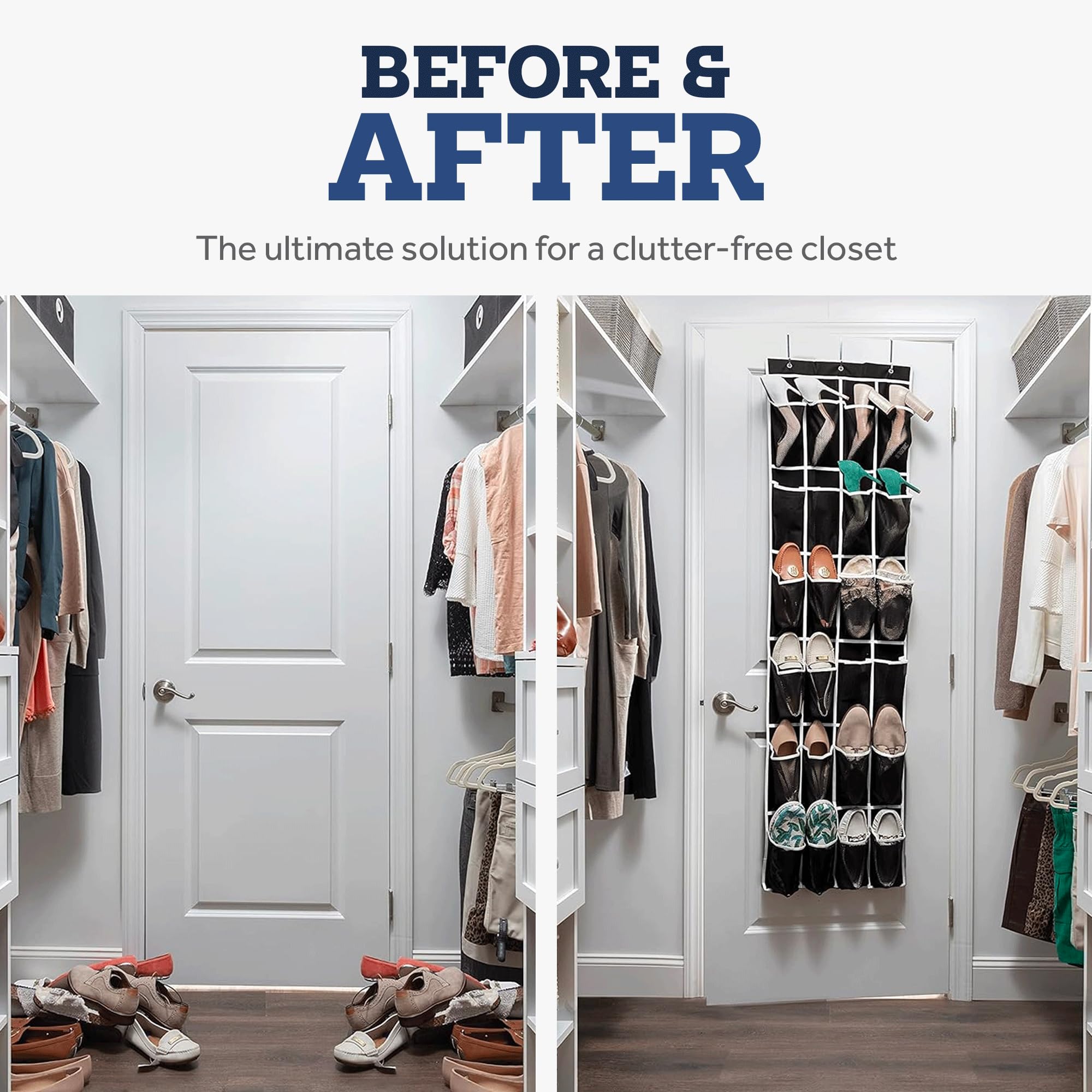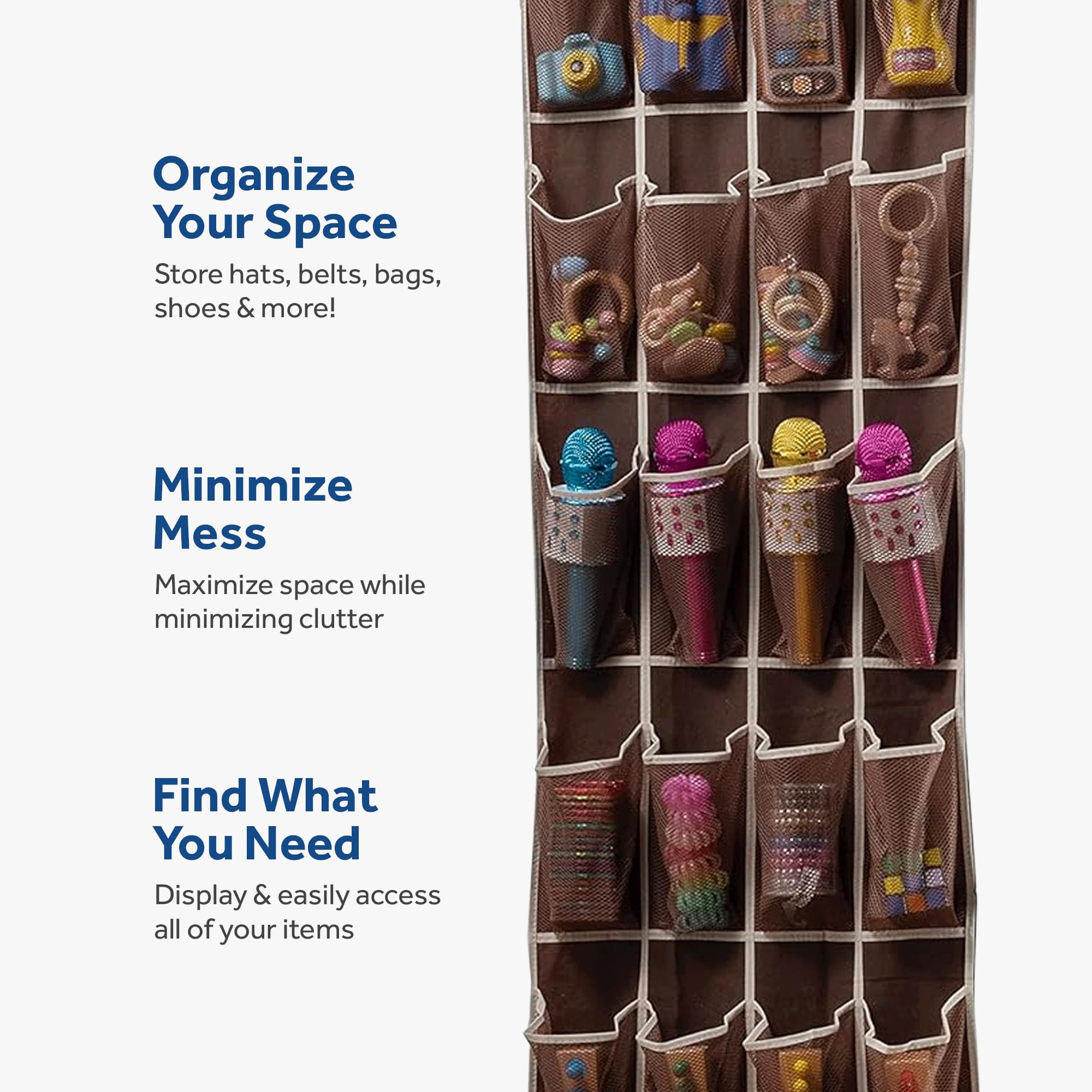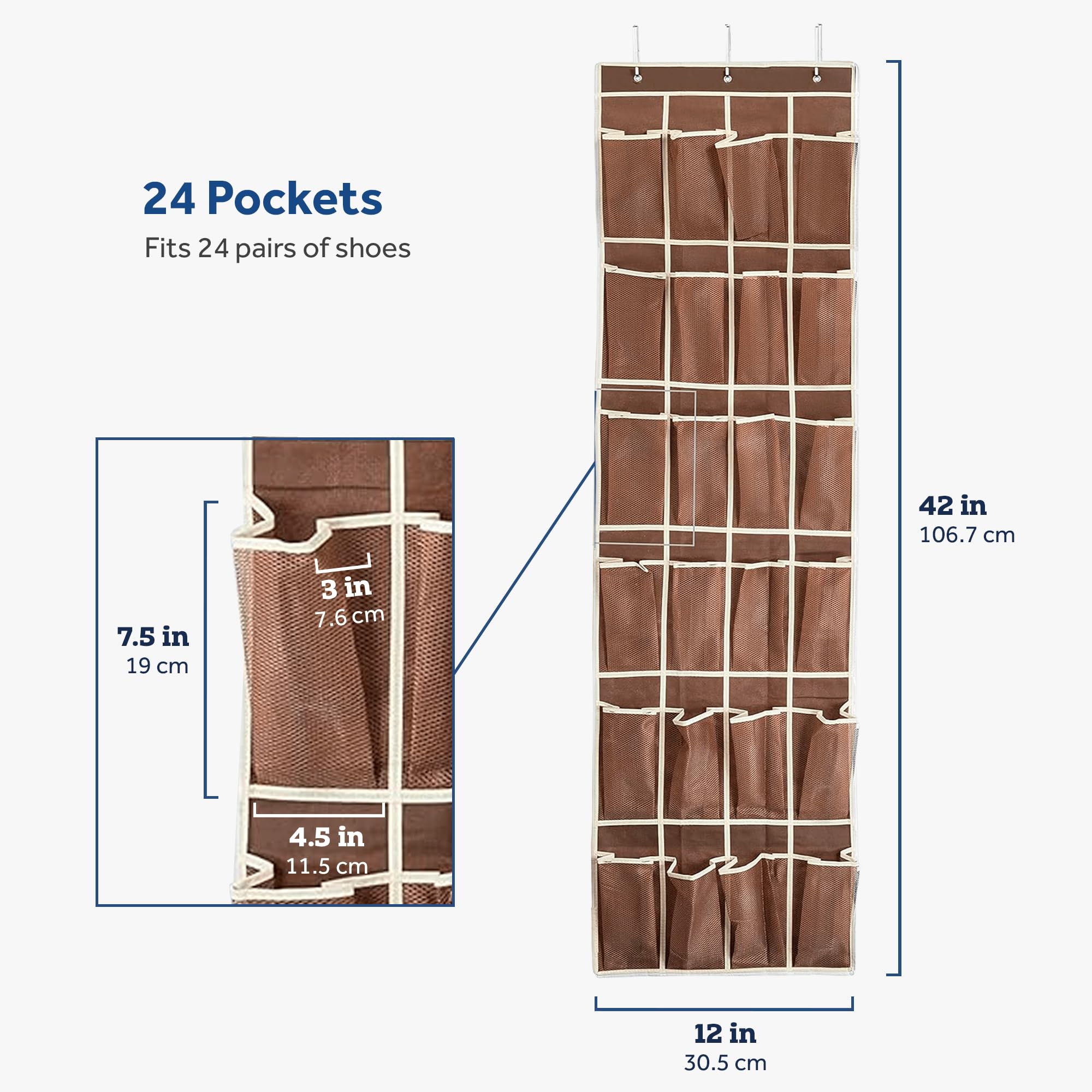 24 Breathable Mesh Pockets 24 mesh pockets allow users to store up to 12 pairs of shoes. The mesh not only allows for easy visibility of contents, but also allows air circulation to penetrate the pockets and keep shoes fresh. Reduce Clutter and Maximize Closet Space Avoid the unsightly look of piled shoes on the floor. The organizer keeps shoes off of the ground and suspended on a door for ultimate maximization of space and making the experience of finding shoes much simpler. 3 Adjustable Door Hooks The adjustable stainless steel hooks hang securely over doors of varying thickness for reliable storage. Durable Nonwoven Construction The organizer is made of heavy duty nonwoven; a high quality material that resists tears and rips! The nonwoven material is extremely breathable and also aids in keeping shoes fresh. Store More This organizer is great for storing socks, scarves, ties, and many other garment items. It's also great to use in other areas of the house for storing items such as toys, cleaning supplies, snacks, craft supplies and much more! Dimensions Shoe organizer: 64" x 18" Pockets are 7.5" tall x 4.5" wide and can be stretched to 3" deep.