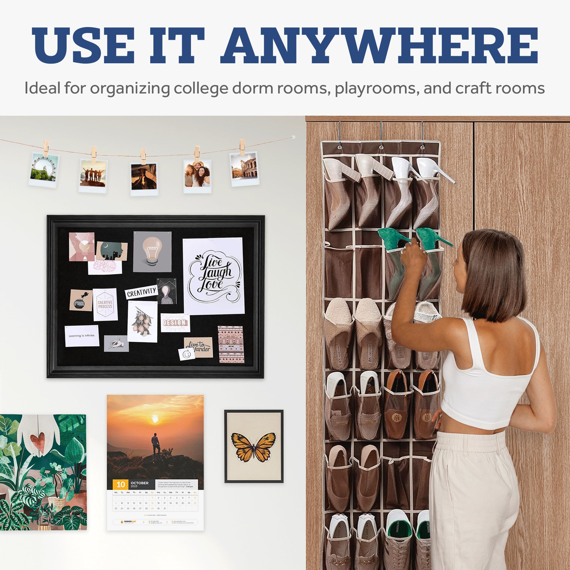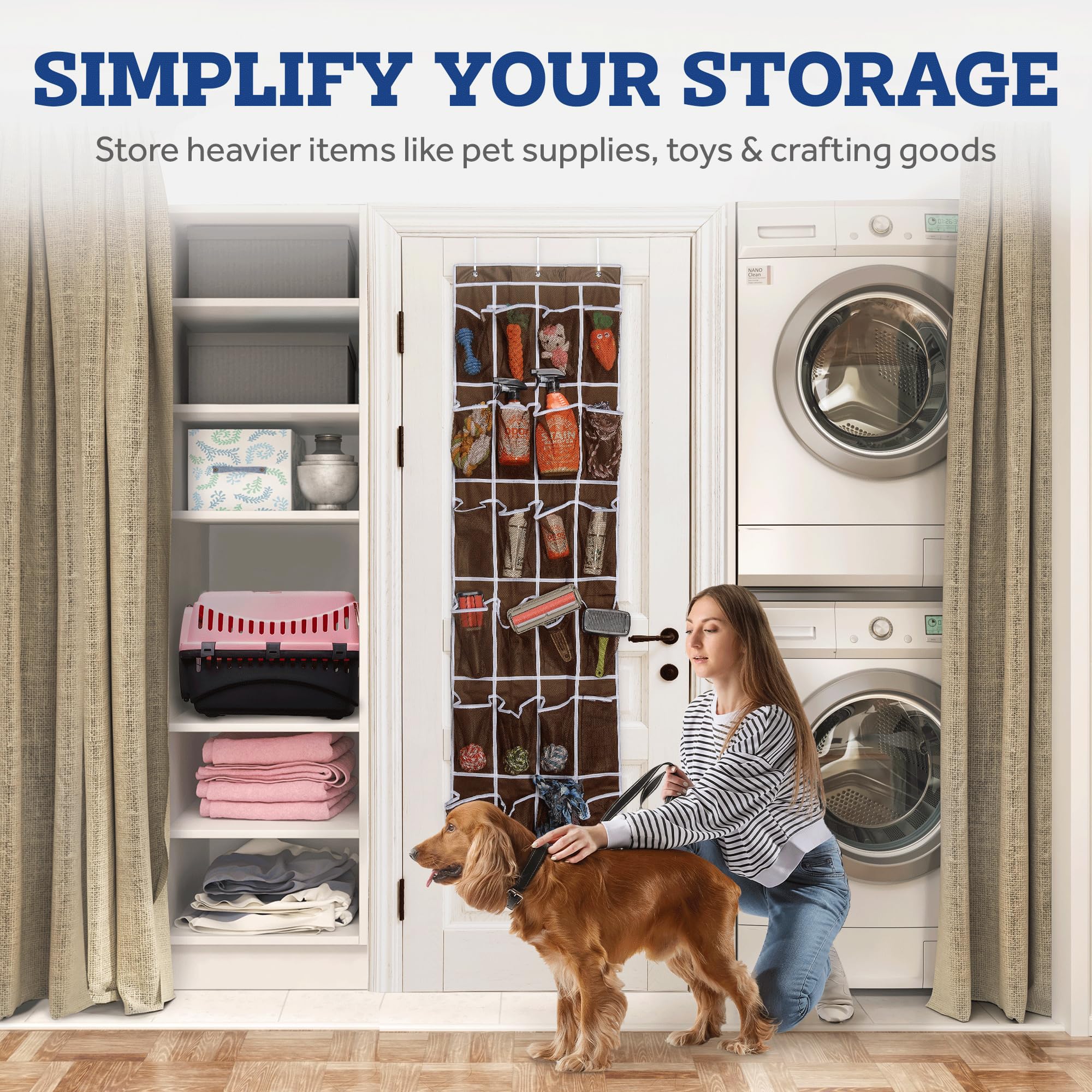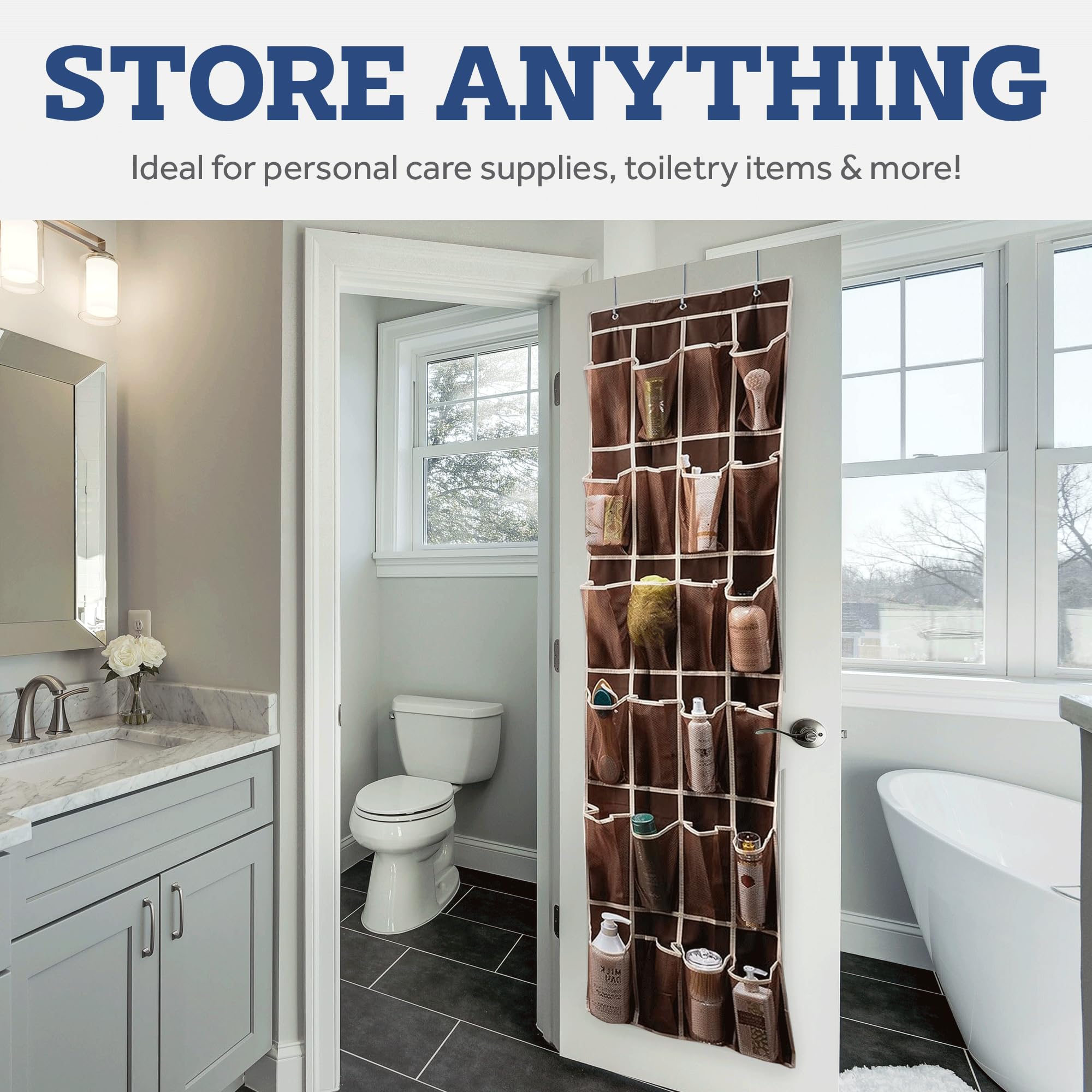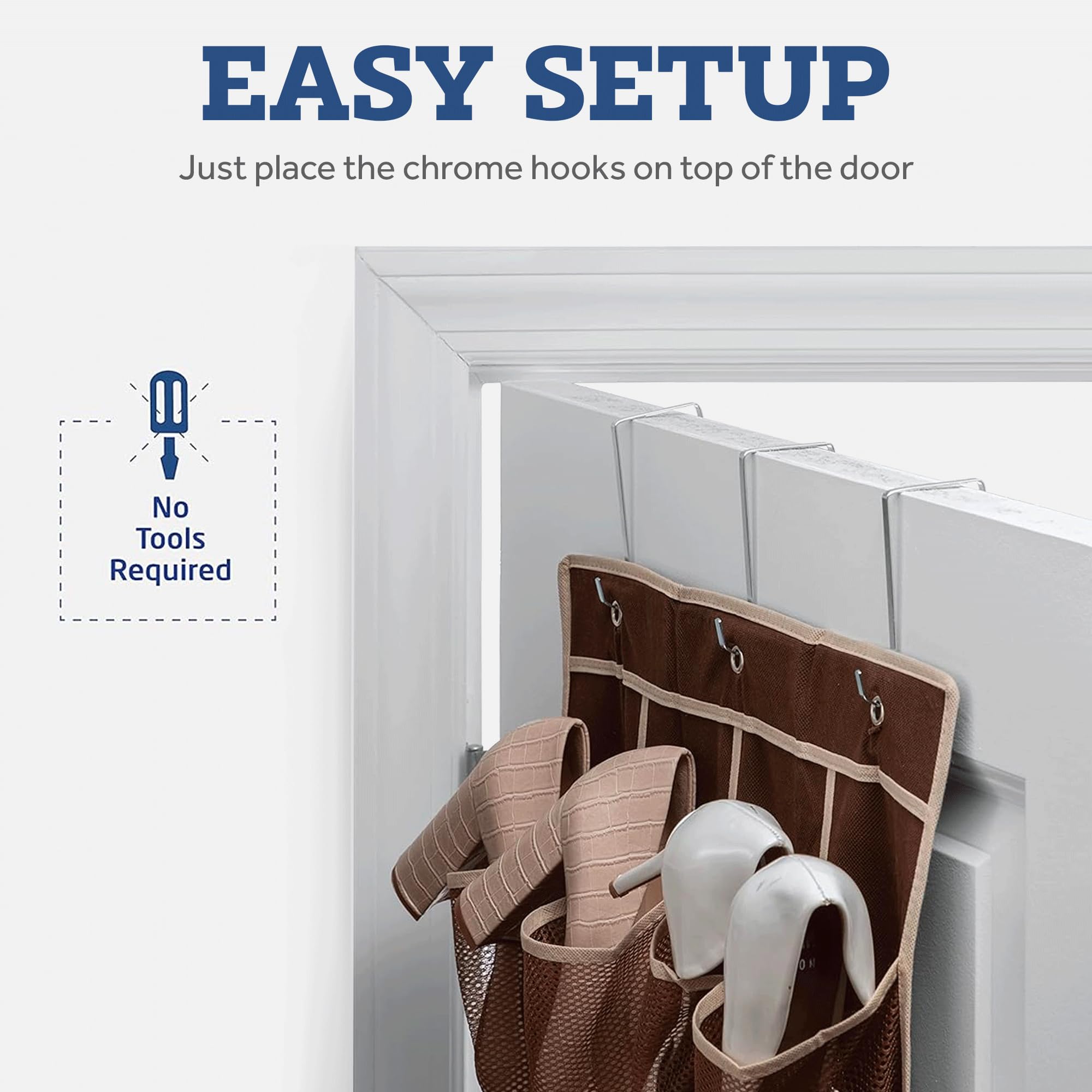 24 Breathable Mesh Pockets 24 mesh pockets allow users to store up to 12 pairs of shoes. The mesh not only allows for easy visibility of contents, but also allows air circulation to penetrate the pockets and keep shoes fresh. Reduce Clutter and Maximize Closet Space Avoid the unsightly look of piled shoes on the floor. The organizer keeps shoes off of the ground and suspended on a door for ultimate maximization of space and making the experience of finding shoes much simpler. 3 Adjustable Door Hooks The adjustable stainless steel hooks hang securely over doors of varying thickness for reliable storage. Durable Nonwoven Construction The organizer is made of heavy duty nonwoven; a high quality material that resists tears and rips! The nonwoven material is extremely breathable and also aids in keeping shoes fresh. Store More This organizer is great for storing socks, scarves, ties, and many other garment items. It's also great to use in other areas of the house for storing items such as toys, cleaning supplies, snacks, craft supplies and much more! Dimensions Shoe organizer: 64" x 18" Pockets are 7.5" tall x 4.5" wide and can be stretched to 3" deep.